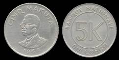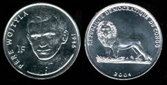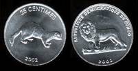 km 1 10 Francs (1965) Aluminumkm 7 10 Sengis (1967) Aluminum km 8 1 Likuta (1967) Aluminumkm 9 5 Makuta (1967) Copper-Nickelkm 75 50 Centimes (2002) Soccer playerkm 76 25 Centimes (2002) Weaselkm 77 25 Centimes (2002) Ramkm 78 50 Centimes (2002) Giraffekm 79 50 Centimes (2002) Gorilla km 80 50 Centimes (2002) Butterfly km 81 1 Franc (2002) Turtlekm 82 1 Franc (2002) Chickenkm 83 25 Centimes (2002) Wild Dogkm 123 50 Centimes (2002) Verney Camereonkm 156 1 Franc (2004) Pope Jean Paul 1946km 157 1 Franc (2004) Pope Jean Paul 1967km 158 1 Franc (2004) Pope Jean Paul 1978km 159 1 Franc (2004) Pope Jean Paul Visitkm 174 1 Franc (2004) African Golden Cat – Copper Nickel